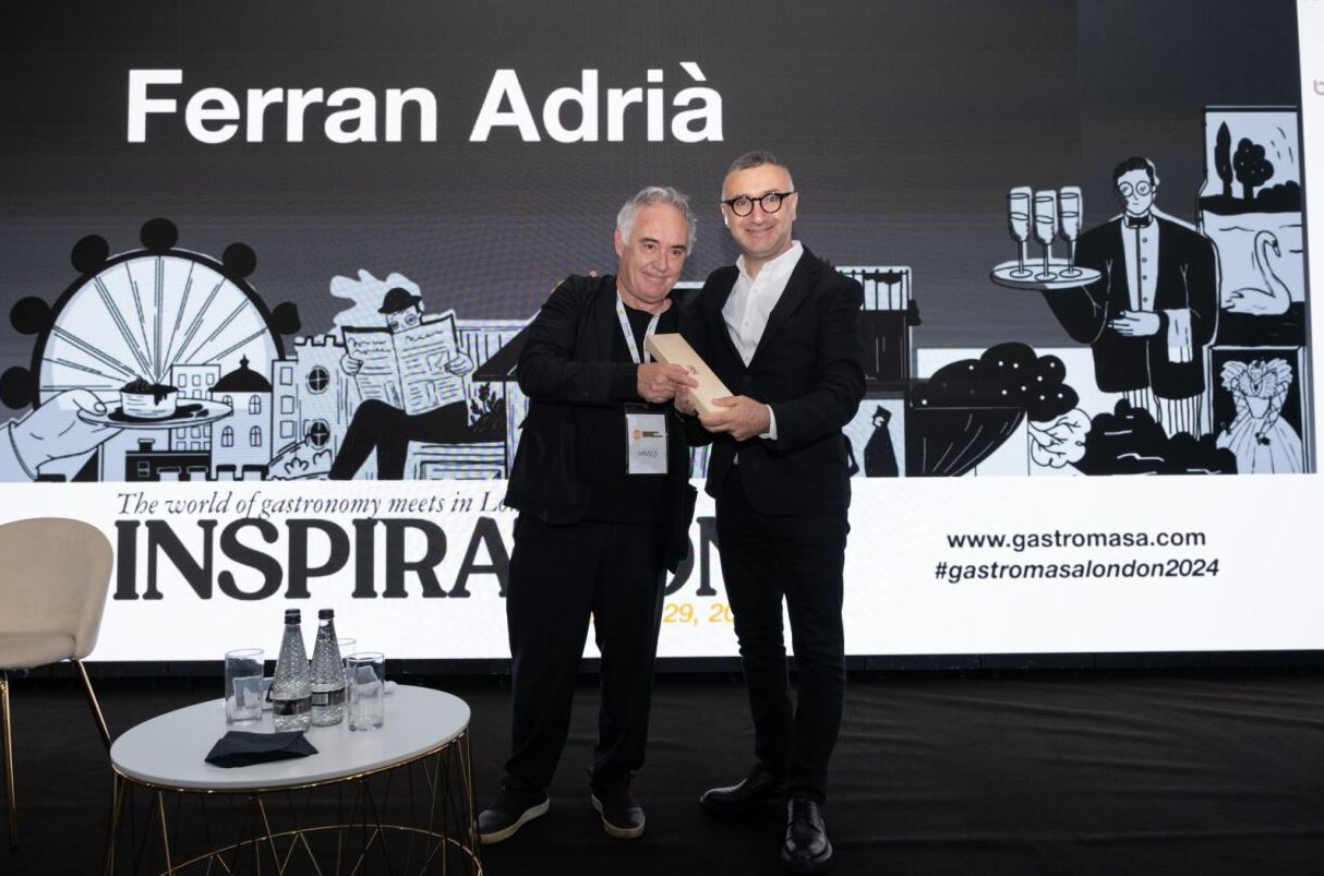 Gastromasa Londra Konferansı’nın Onur Konuğu Ferran Adrià’ya konuşması sonrasında Sözen Grup CEO’su ve Gastromasa Kurucusu Gökmen Sözen tarafından ‘Inspiration Honour Award’ takdim edildi.
