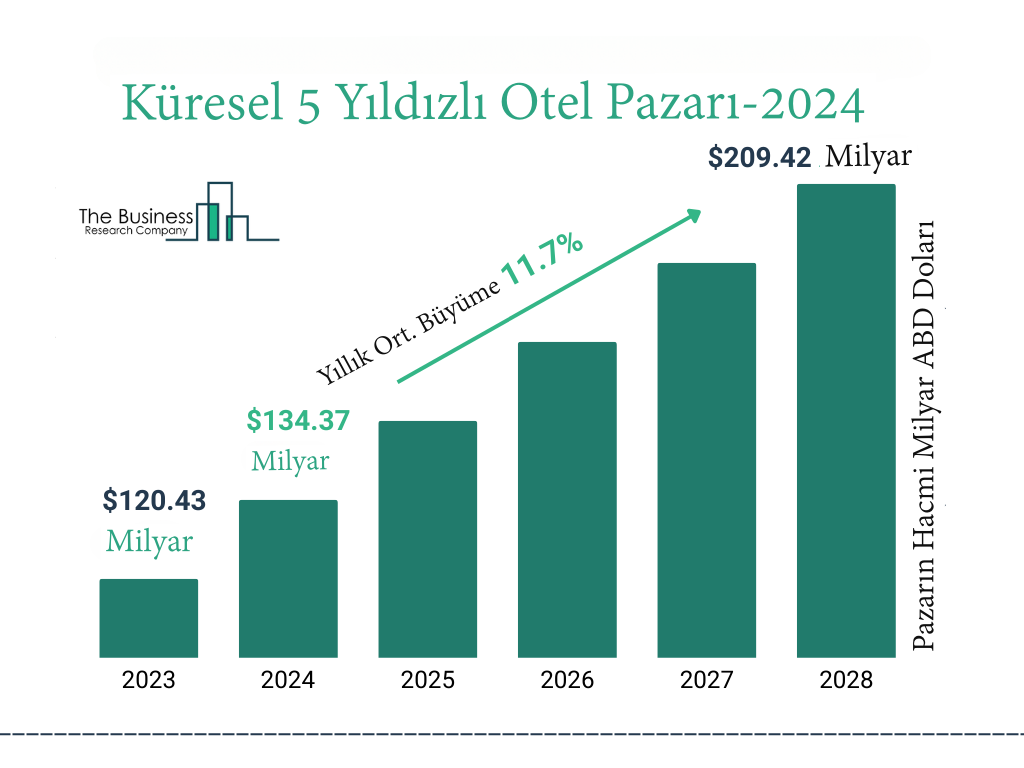 www.turkiyeturizmansiklopedisi.com’unThe Business Research Şirketi’nin “Beş Yıldızlı Otel Küresel Pazar Raporu, Trendler ve Küresel Tahmin 2024-2028” adlı raporundan derlediği bilgilere göre, pazarın hacmi 2028 yılına gelindiğinde ise yıllık ortalama 11,7’lik büyümeyle 209,42 milyar dolara ulaşacak.